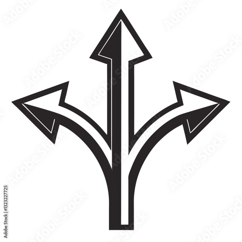 Black and white three-way directional arrow symbol, road sign icon for navigation, choice, decision-making, and multiple path directions