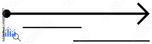 Black arrow with thick start, parallel lines, magnifying glass analyzing graph. Ideal for growth, focus, analysis, direction, progress strategy goals. Flat simple metaphor