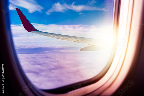 Black background with copy space with look of window frame of airplane flight see view of sunset clouds, airplane wing, ice mountains for luxury trip tourism travel transportation concept