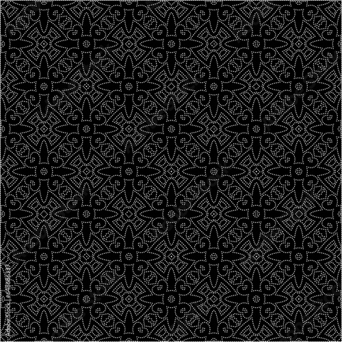 Black background with figures from dots . Black and white pattern for web page, textures, card, poster, fabric, textile. Repeating design.