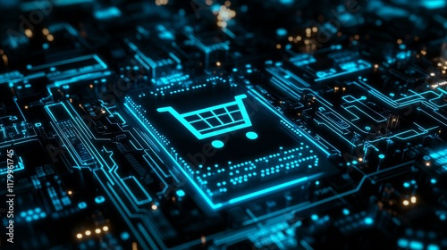 Black background with glowing blue circuits and a shopping cart icon, representing e-commerce