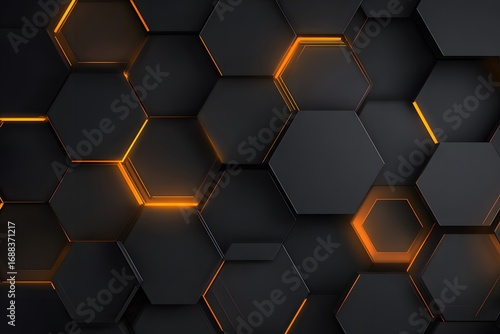 Black background with orange glowing geometric shapes, dark and modern technology style, with black squares arranged in an octagonal pattern