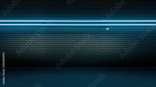 Black brick wall with a blue neon light running horizontally across its top, creating a striking contrast and modern ambiance