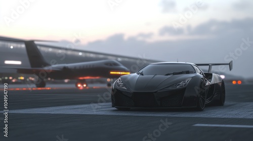 Black car and private plane on runway, sleek, luxurious scene at the airport, capturing elite travel style