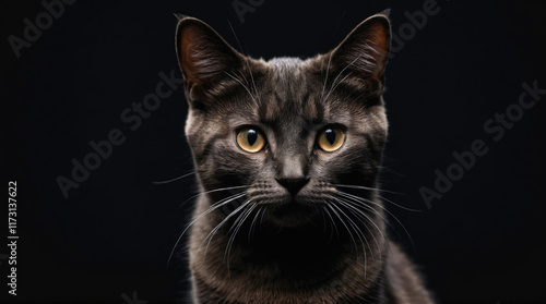 Black cat sits calmly against dark background, showcasing striking eyes and smooth fur, captured in soft lighting