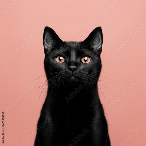 Black cat with striking amber eyes poses against a soft pink background, showcasing its sleek fur and confident demeanor in a captivating portrait