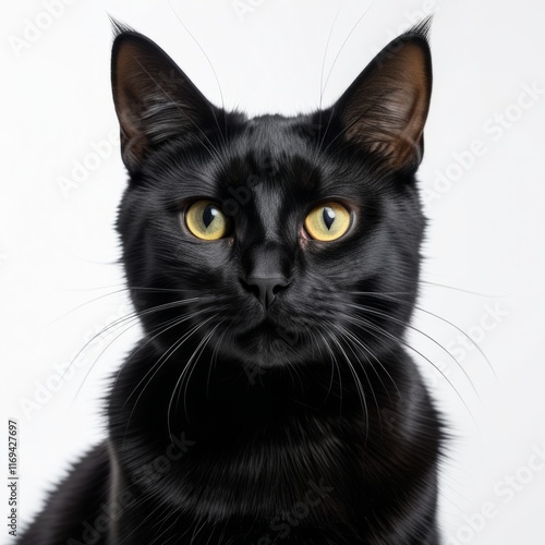 Black cat with striking yellow eyes posing against a white background in a studio setting