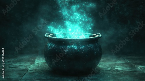 Black cauldron with a magical aura, depicted in a 3D illustration, evoking themes of fantasy and mystery.