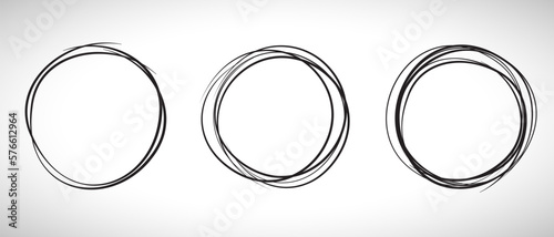 Black circle line hand drawn set. Highlight hand drawing circle isolated on background. Round handwritten circle. For marking text, note, mark icon, number, marker pen, pencil and text check, vector