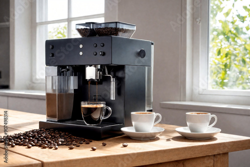 Black coffee machine with cup on counter in kitchen