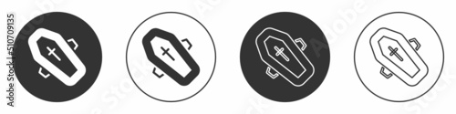Black Coffin with christian cross icon isolated on white background. Happy Halloween party. Circle button. Vector