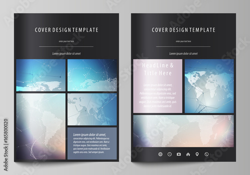 Black colored vector illustration of editable layout of A4 format covers design templates for brochure, magazine, flyer, booklet. Polygonal geometric linear texture. Global network, dig data concept.
