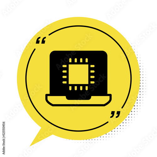 Black Computer processor with microcircuits CPU icon isolated on white background. Chip or cpu with circuit board. Micro processor. Yellow speech bubble symbol. Vector