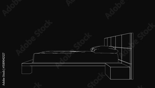Black contour illustration of a bed with a pillow, featuring clean lines and minimalist style. The dark background enhances the stark contrast. Simple yet elegant design suitable for modern interiors.