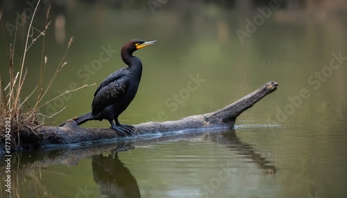 Black cormorant bird stands on submerged log in calm green water. Wild waterfowl rests near dry reeds in natural habitat. Distinctive yellow beak, brown head. Bird looks for food in quiet pond.