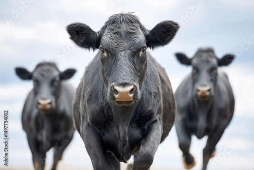 Black cow close up with two cows in background on cloudy day, showing curious and calm farm animals in natural environment