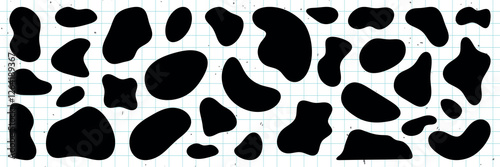 Black cow spots pattern on white background. Cow spots create a unique, abstract design. Perfect for cow-themed projects or cow print enthusiasts. Black shape vector set.