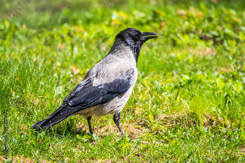 Black crow walks on green lawn. Raven on grass. Wild bird on meadow.