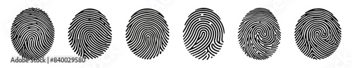 Black detailed fingerprints flat illustration set. Police electronic scanner of thumb print for crime data isolated on white background vector collection. Finger identity and technology concept