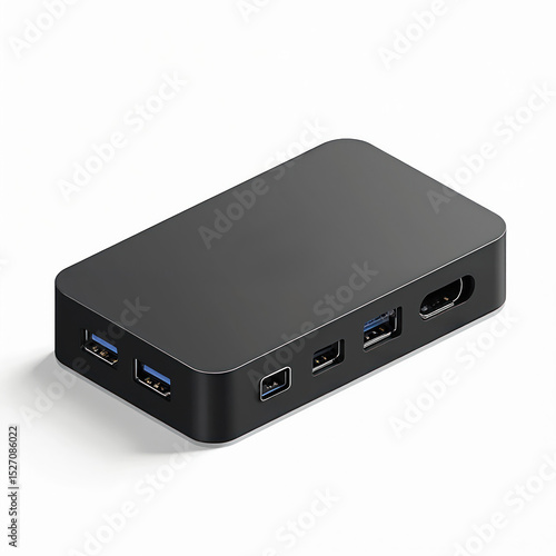 Black docking station visual illustration. Computer hardware element, isolated on white background. Modern technology platform. Provides various ports, interfaces for laptop, desktop.