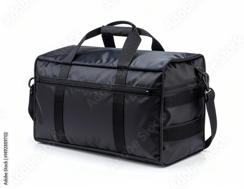 Black duffel bag, a simple carry-all, sleek design with top handles and shoulder strap