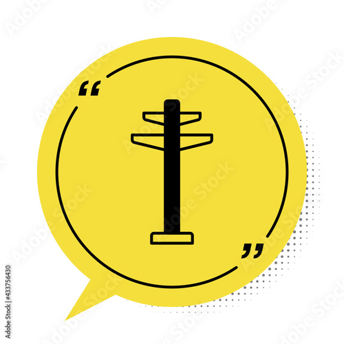 Black Electric tower used to support an overhead power line icon isolated on white background. High voltage power pole line. Yellow speech bubble symbol. Vector