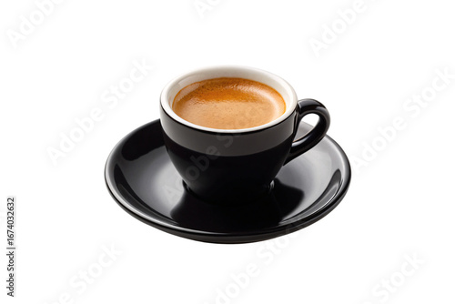 Black espresso cup with saucer containing golden crema coffee, professional studio lighting, isolated on a transparent background