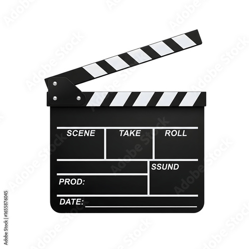 Black film clapperboard with white stripes and text fields isolated on transparent background