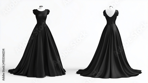 Black formal dress mockup front and back view isolated on white background for brand presentation