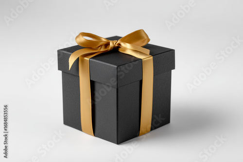 black gift box with a ribbon, in a large square-shaped packaging for products or gifts, isolated on a white background