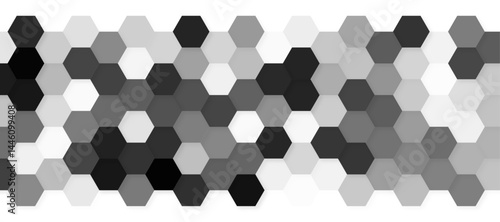 Black hexagon pattern on a clean white background, modern and minimalistic design. Geometric layout with evenly spaced hexagons, subtle shadows for depth, high-resolution vector style.