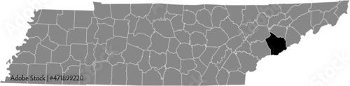 Black highlighted location map of the Sevier County inside gray administrative map of the Federal State of Tennessee, USA