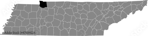 Black highlighted location map of the Stewart County inside gray administrative map of the Federal State of Tennessee, USA