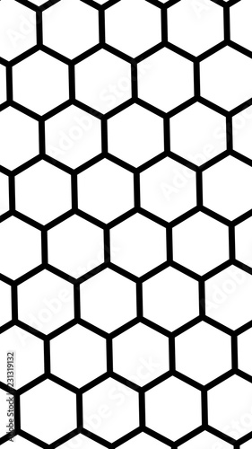 Black honeycomb on a white background. Isometric geometry. Vertical image orientation. 3D illustration