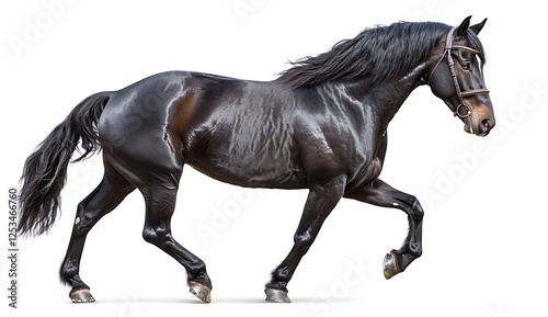 Black Horse in Motion: A powerful black horse with flowing mane and tail gallops gracefully, capturing the essence of speed, energy, and freedom.