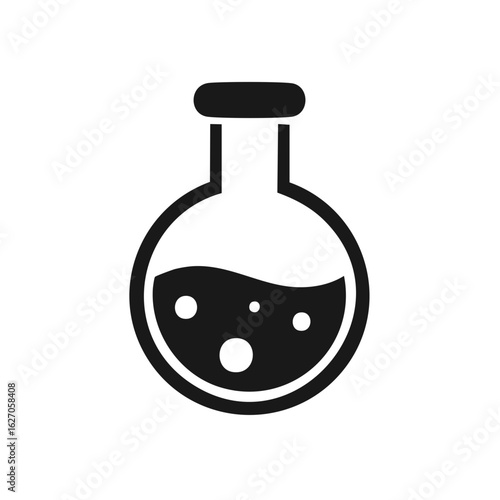 Black icon of a round bottom flask with dark liquid and bubbles, simple clean vector