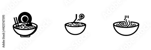 Black icon set featuring different styles of noodle bowls and chopsticks illustrating culinary diversity in Asian cuisine