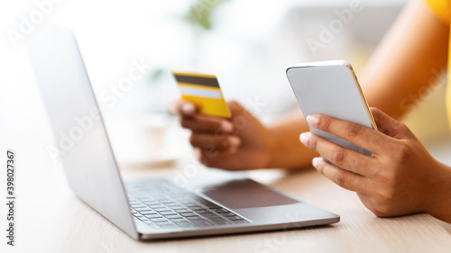 Black lady using smartphone and credit card sitting at desk