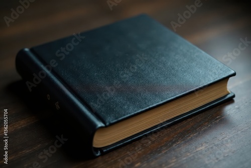 Black leather book with a subtle sheen, standing vertically on a dark wooden surface , dark wood, black leather