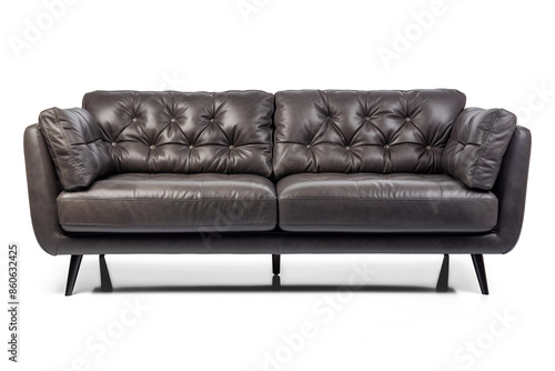 Black leather sofa. Modern couch on a transparent background. PNG.