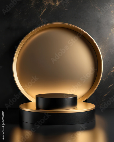 Black Luxury Gold Empty Podium Background With Presentation Product Stand Or Abstract Gold Cosmetic Display On Pedestal And Premium Modern Round Showcase On Elegant Mockup Background