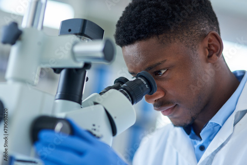 Black man, scientist and microscope for research, testing and study vaccine results or solution. Lens, doctor and male person for forensic exam in lab or pharma, biotech and innovation in medicine