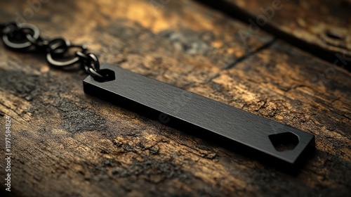 Black Metal Keychain on Rustic Wooden Surface with Textured Finish