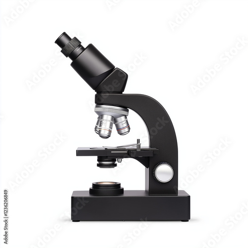 black microscope with silver eyepiece, featuring sleek design and adjustable focus. Ideal for laboratory use, this instrument is essential for scientific research and education
