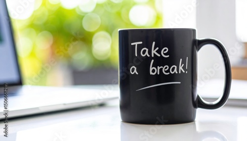 Black mug with the words take a break is on a table. Suitable for social media posts, website banners, and promotional materials.
