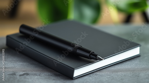Black notebook with a pen resting on a concrete surface surrounded by greenery in a softly lit indoor setting during the day. Generative AI