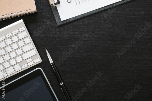 black office desk table with computer, tablet, mobile phone, and office supplies - table top view with copy space