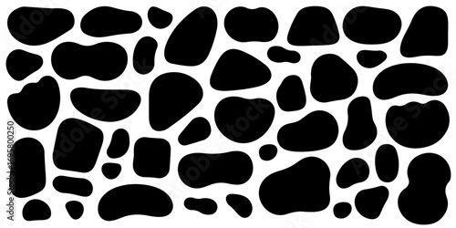 Black organic oval and round shapes set. Blob and spot deform silhouettes. Unique black and white cowhide pattern with irregular shapes and designs. Set of black organic, irregular, and amorphous.