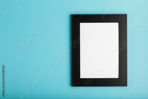 Black photo frame with empty space on a blue background.