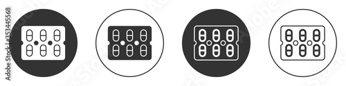 Black Pills in blister pack icon isolated on white background. Medical drug package for tablet, vitamin, antibiotic, aspirin. Circle button. Vector Illustration.